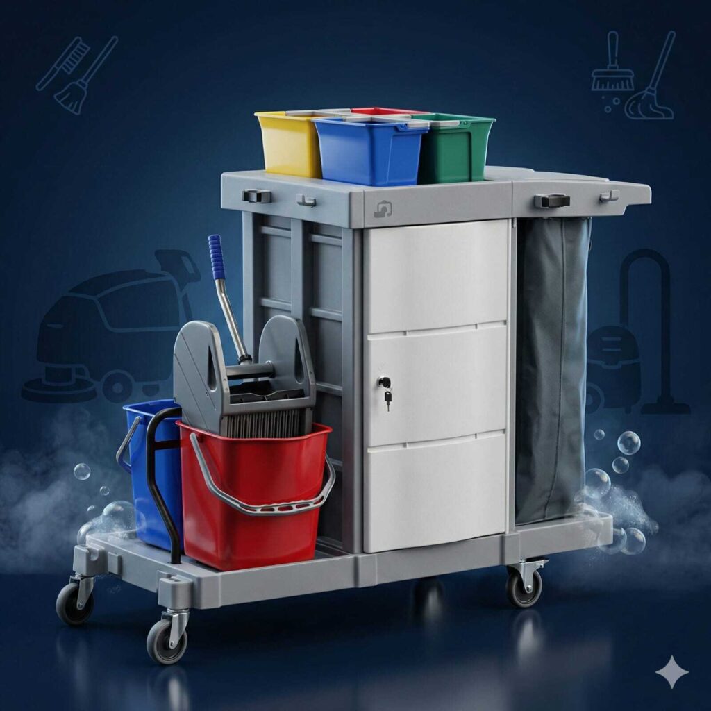 This Professional Multi-Purpose Janitorial Cleaning Trolley is a complete, all-in-one mobile station designed for high-efficiency facility